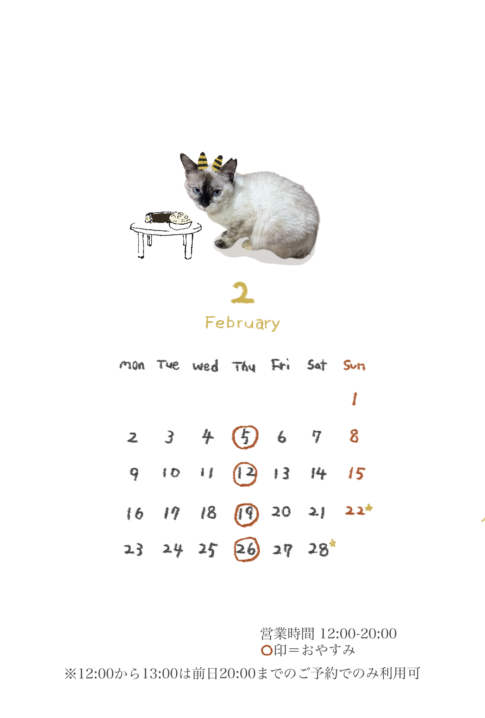 | 営業時間 | 13:00~20:00 ※12:00~13:00は完全ご予約制。前日12:00までのご予約の方のみご利用いただけます |