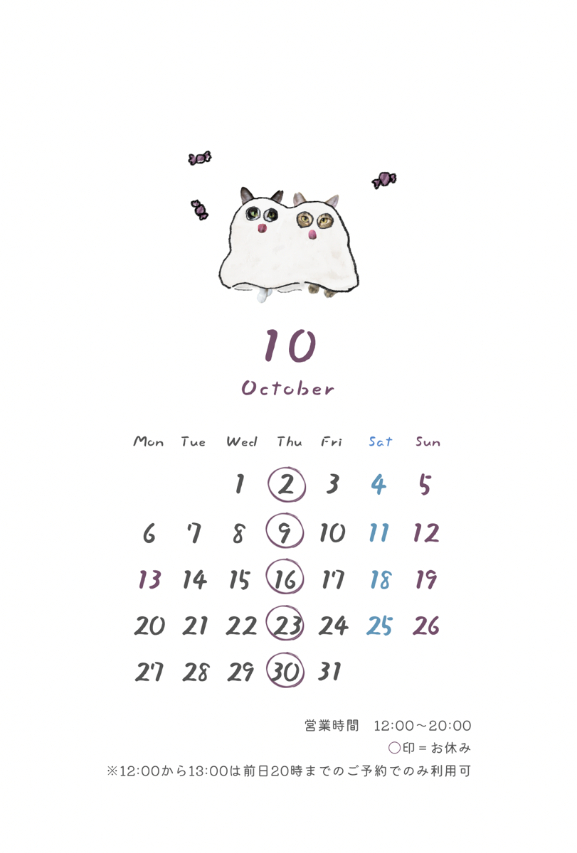 お知らせ2025.03.013月の営業日 毎週木曜日に定休日をいただいておりますが、3月20日(木)は祝日のため営業いたします。代わりに3月19日(水)をお休みさせていただきますので、お間違いないようお気をつけください。 12時から13時の1時間は通常料金で貸し切り利用が可能です🐈🌷※前日20時までのご予約必須! ご予約・お問い合わせはこちらから 保護中: ハルくんの憂鬱2025.10.09保護中: ⚡電撃!つむぎ王国⚡2025.09.2410月の営業日2025.09.22ひよりちゃん2025.09.22
