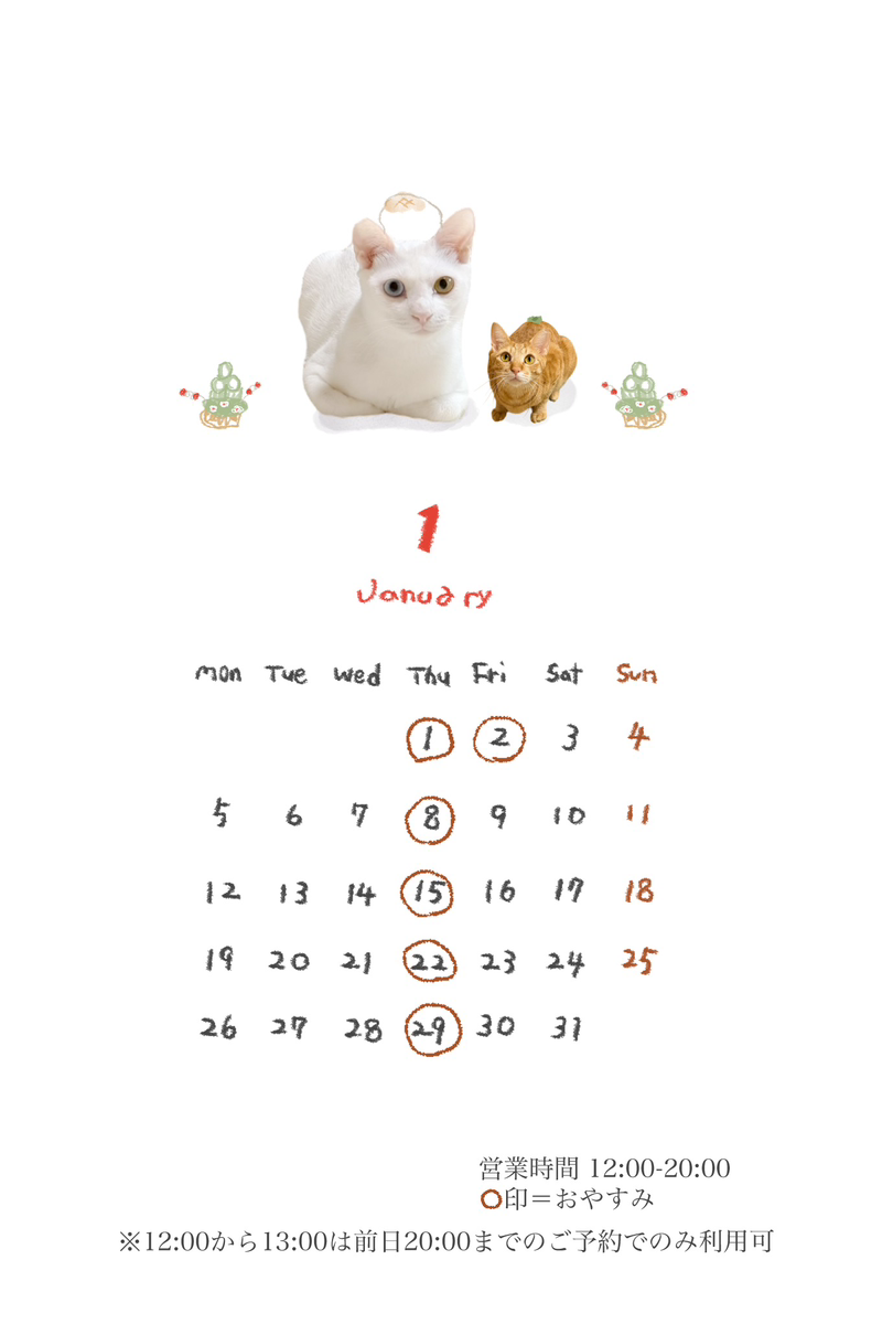 お知らせ2025.12.301月の営業日 今年ももっちゃりを応援してくださり誠にありがとうございました。 毎週木曜日+年末年始は12/31~1/2までお休みをいただきます。新年は1月3日より通常営業いたしますので、どうぞよろしくお願いいたします。12:00~13:00の1時間は、通常料金で貸し切り利用が可能です🐈🎍※前日20時までのご予約必須!お気軽にお問合せください◎ ご予約・お問い合わせはこちらから 1月の営業日2025.12.30かなでちゃん2025.12.0112月の営業日2025.12.0111月の営業日2025.10.26